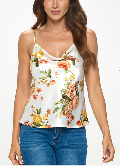 Elevate your wardrobe with our stretch satin ivory cowl neck top. This elegant and luxurious piece features a sophisticated cowl neckline and a beautiful flower print. The soft and stretchy fabric blend of 96% polyester and 4% spandex ensures comfort and a perfect fit. Whether you're dressing up for a night out or adding a touch of elegance to your everyday look, this top is a versatile and stylish choice. Pair it with a skirt for a dressy ensemble or with jeans for a more casual yet polished look. With a model height of 5'9" and a bust measurement of 34C, this top is available in various sizes to perfectly fit and flatter any figure.